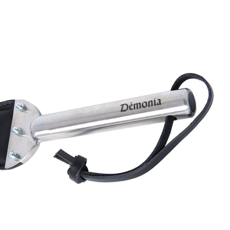 superb small black leather paddle with steel handle stamped "Dèmonia".