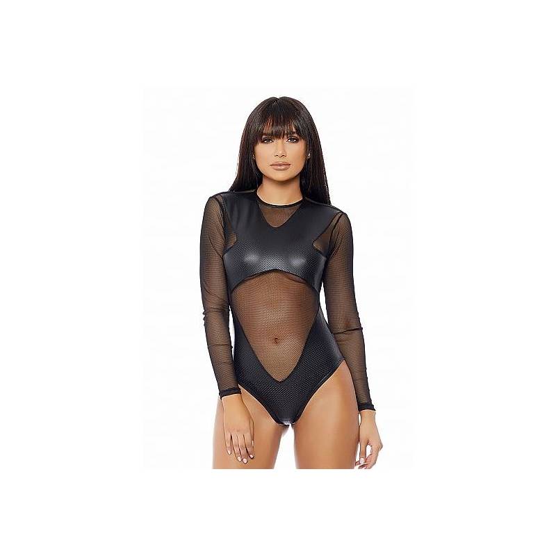 Long sleeve micro mesh bodysuit with perforated faux leather X contrast and panty detail. The bodysuit has a zipper at the back