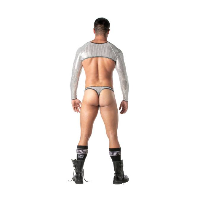 Also available in Gold, this men's silver sequined bolero combines lightness, sparkle and a close-fitting cut for an instant sexy effect. Metallic details reinforce its fetish aesthetic, offering a festive yet provocative look. Perfect for standing out in the evening or asserting your style in a man's fetish outfit.