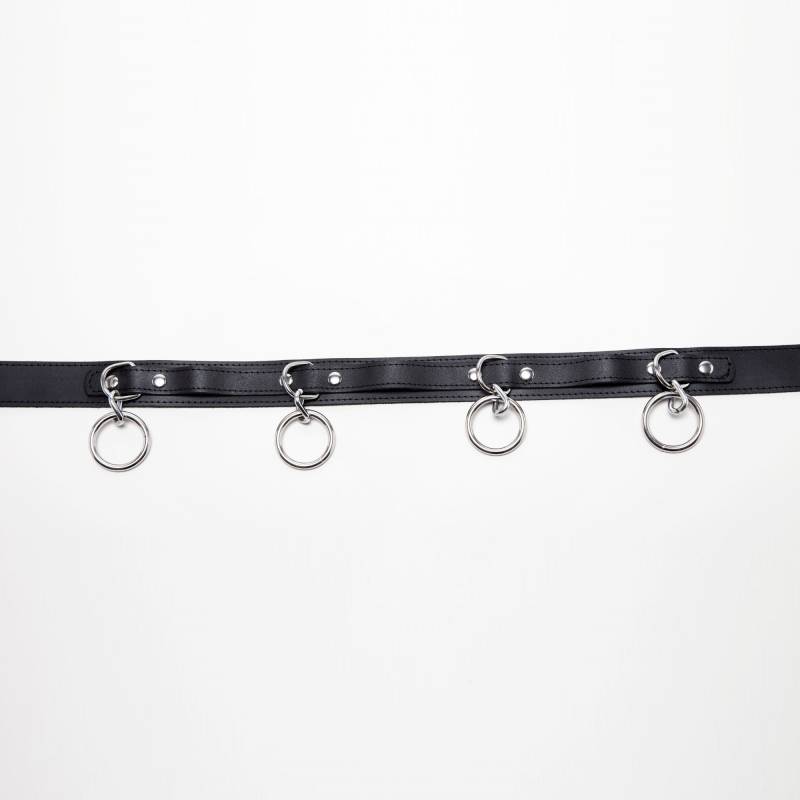 Bondage belt made in a beautiful black leather with a riveted strap, also in black leather, in which metal rings pass.