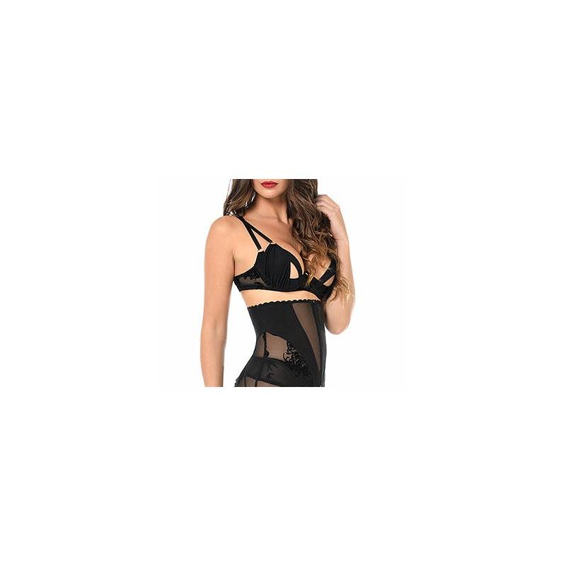 Very sexy bra made in a mix of transparent black veil plain at the chest, and patterned on the rest of the bra. A small metallic heart is located in the middle, delicately adorning the chest.