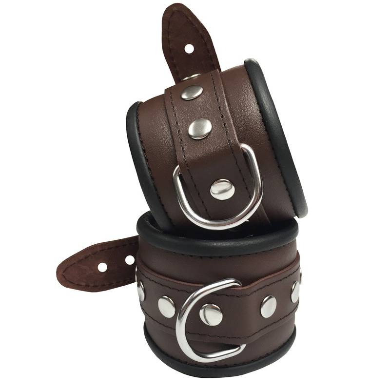 Brown leather handcuffs of very good quality with riveted straps and metal ring, from the"Demonia collection".
