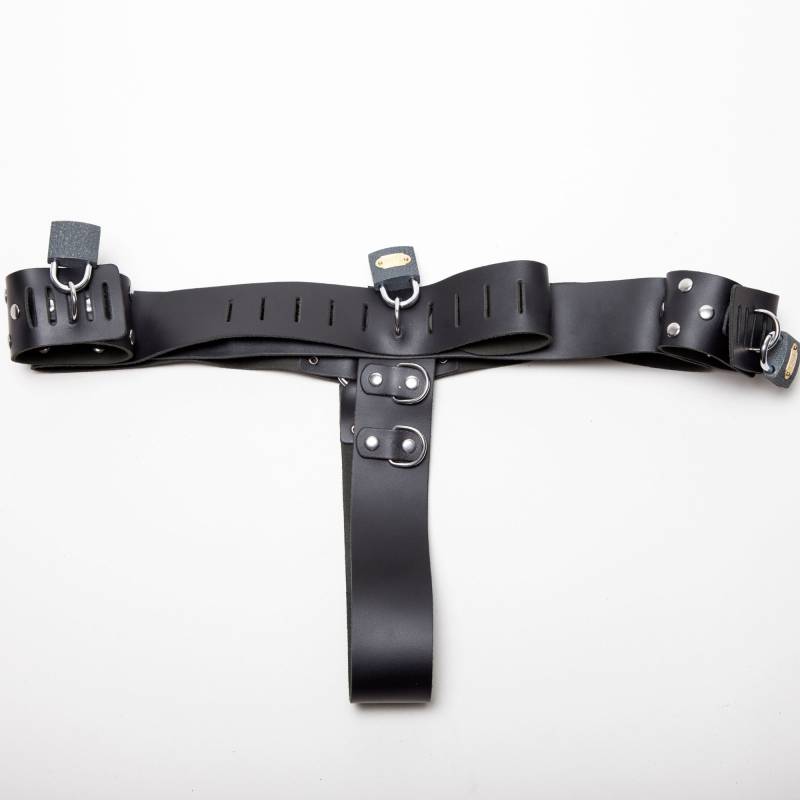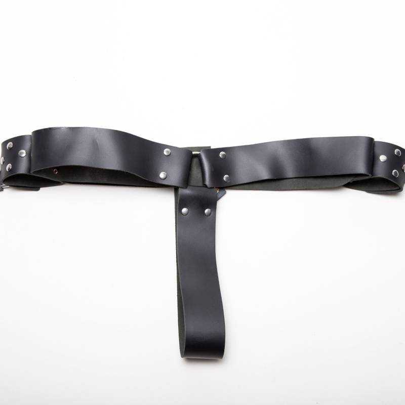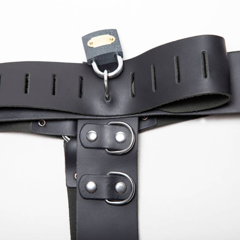 Another strap, just as wide (5cm) passes between the legs, thus ensuring chastity. This strap is equipped with 3 rings allowing an adjustment in height of the belt.