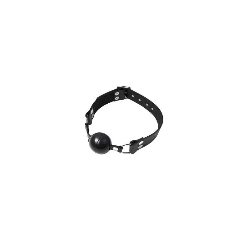 Black gag with hard ball and leather straps adjustable by buckle. Finished with chrome steel rivets.