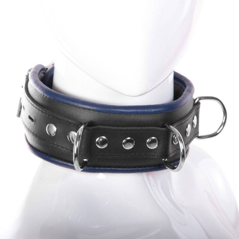 Thick leather collar slightly padded black and blue with a riveted strap from which are connected 4 rings of attachment.