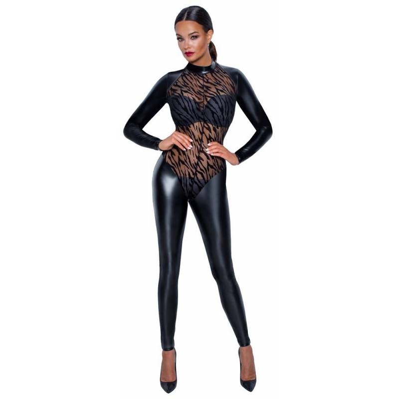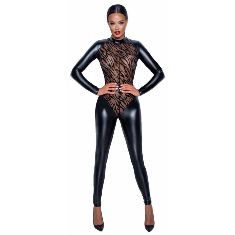 Long-sleeved jumpsuit from Noir made entirely from wetlook and featuring a sheer voile insert with fine velvet flock print in a tiger look on the front.
