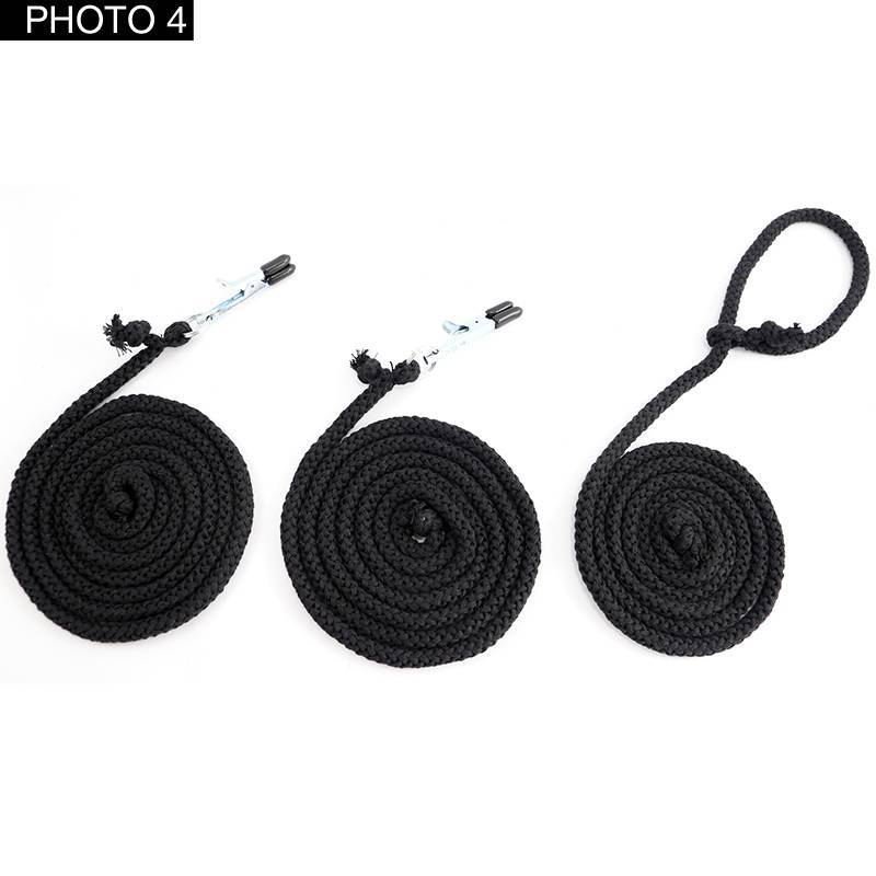 1 pair of handcuffs - 1 pair of ankles - 1 collar, made of nylon with a foam part for maximum comfort, but also a penis or testicle cockring and a pair of breast clamps. All these accessories have a strap allowing to be constrained!