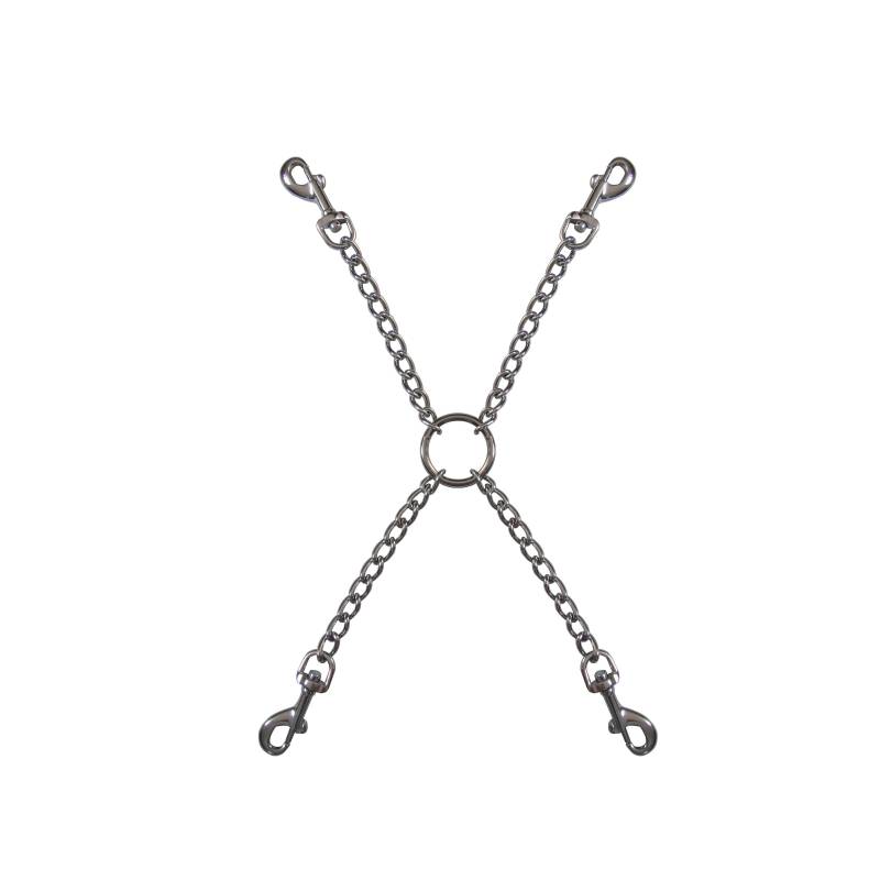 "Multi-chain" allowing to constrain your partner. Thanks to its 4 chains equipped with snap hooks and attached to a ring, you can attach handcuffs and anklets simultaneously.