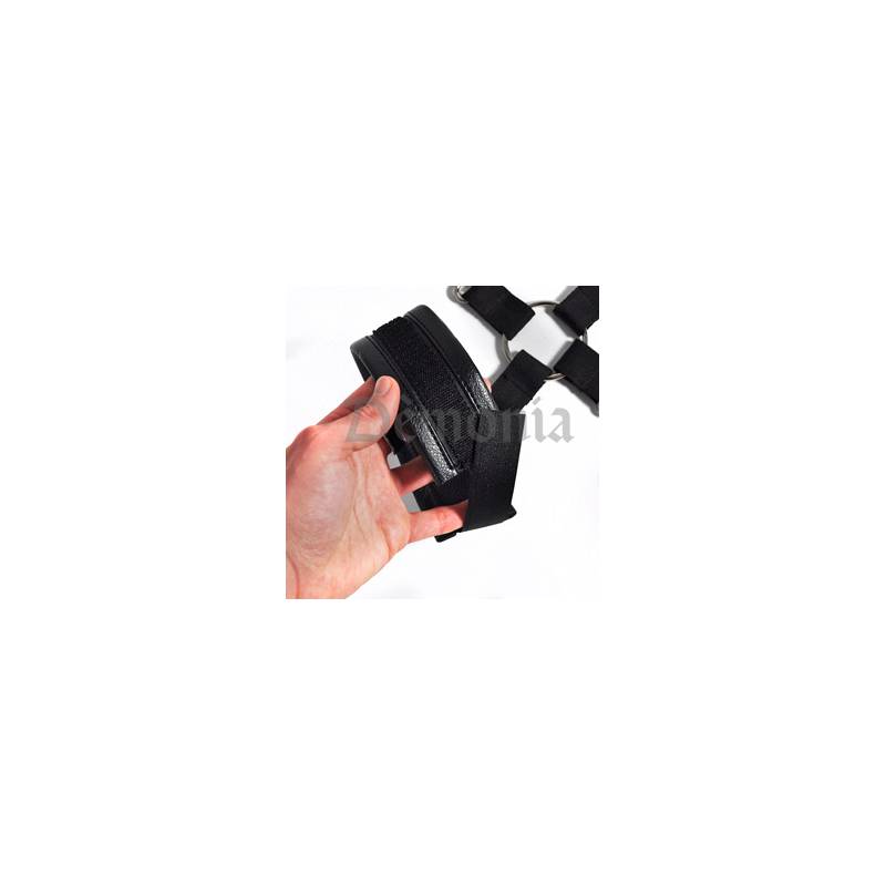 Fabric and cross restraint with 4 carabiners that you will hang on the two handcuffs and the 2 anklets.