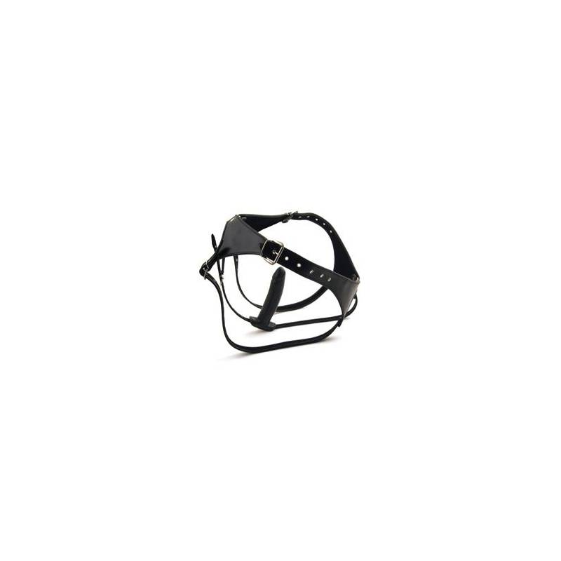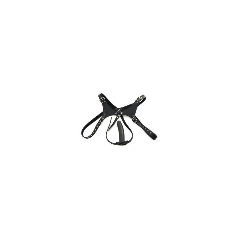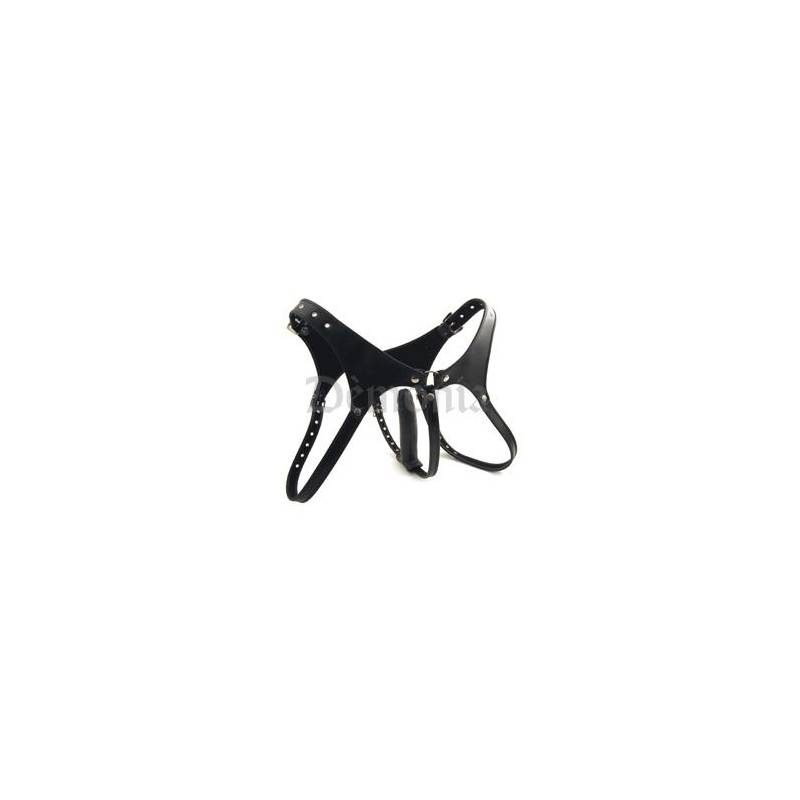 A strap located on each side, passes between the legs, a third adjustable strap also passes between the legs, the internal dildo, mounted on a leg, slides on the strap to allow a better penetration.