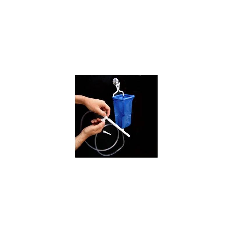 Enema tank, foldable, with suction hook and two interchangeable tips.