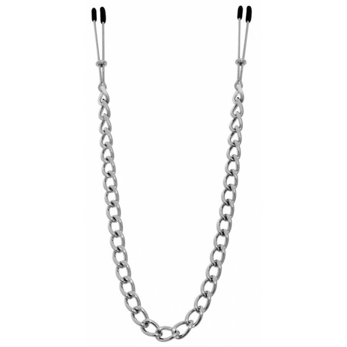 Metal breast clamps with black rubber tips at the pinch to prevent injury. These clamps are progressive clamps, which means that you can choose the hardness of the clamp with the mobile ring. The closer it is to the clamps, the stronger the clamp.