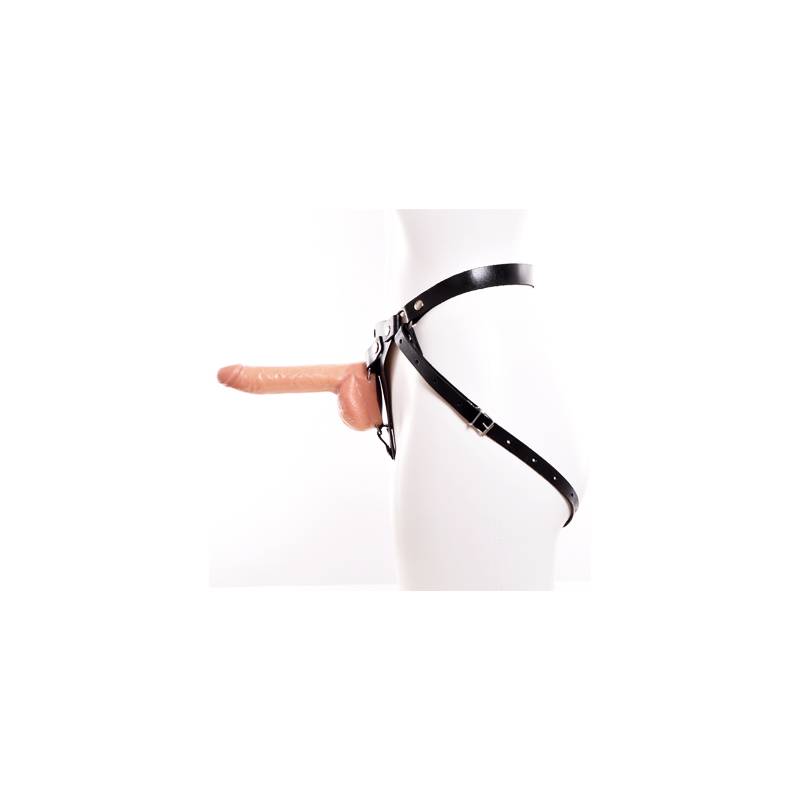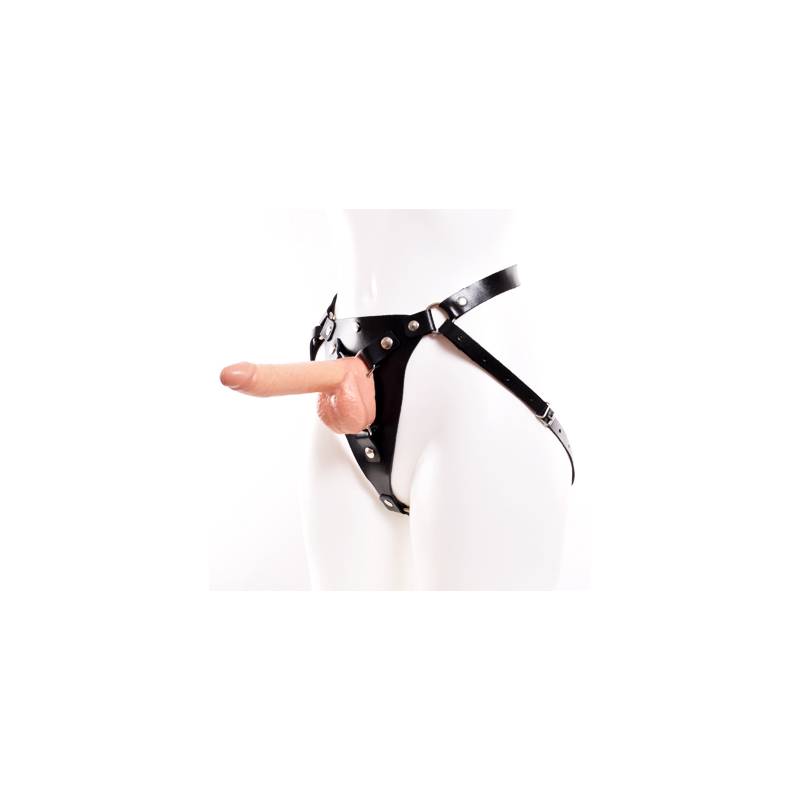 The dildo, made of soft plastisol, reproduction of a penis with its testicles, is attached to the belt by 4 small leather legs.