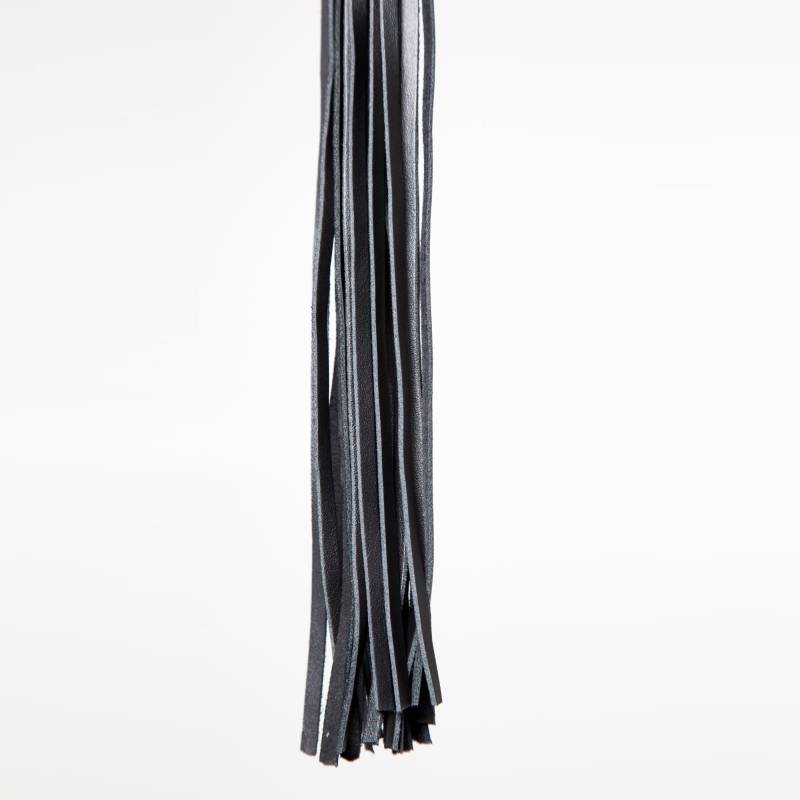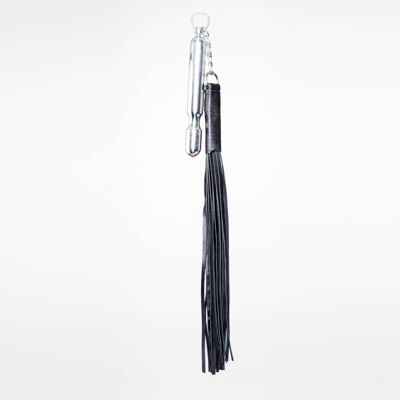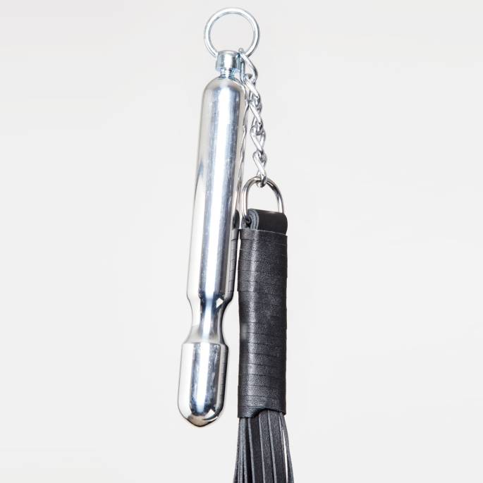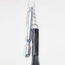 Leather swift with 16 hard leather straps. The handle is connected by a metal chain to an aluminium dildo, which can be used as a handle.