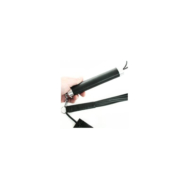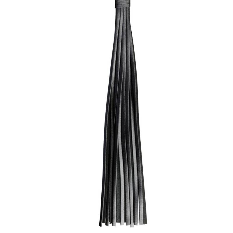 Leather swift with 16 hard leather straps. The handle is connected by a metal chain to a handle made of metal and leather.