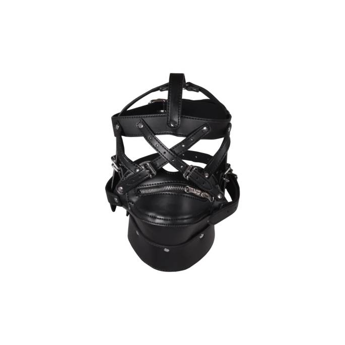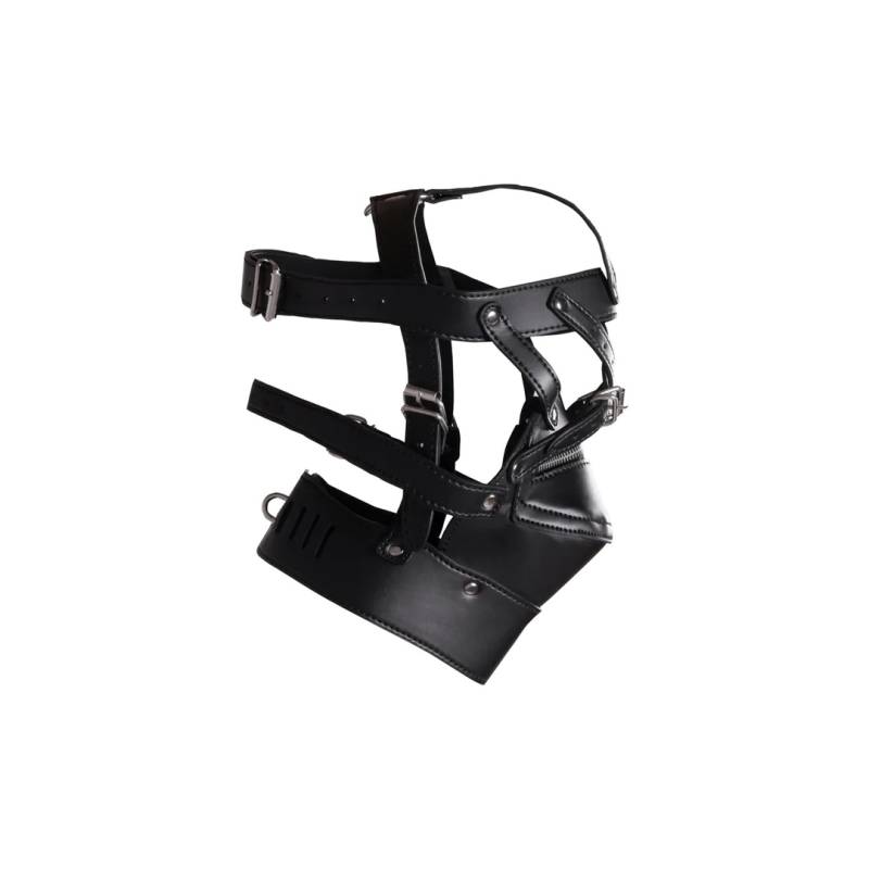 Leather cage hood with straps and rivet.Reinforcement above the head with suspension clip.
