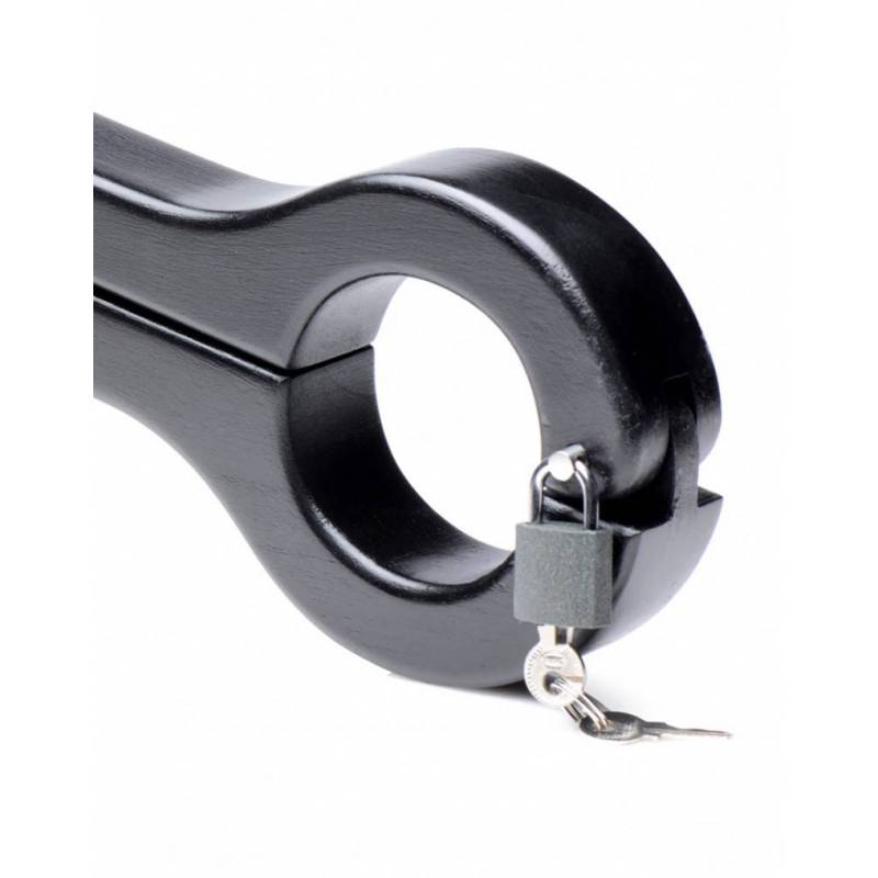 This black wooden humbler works as a ballstretcher where you can handcuff the hands and lock with a padlock.