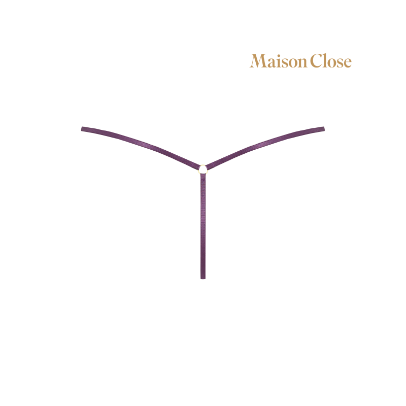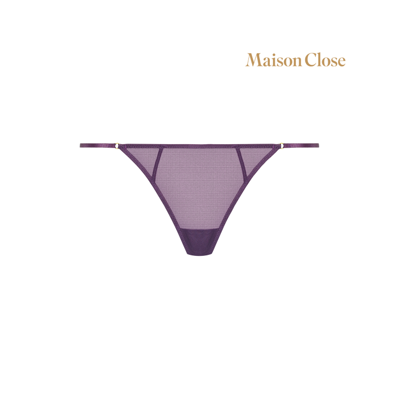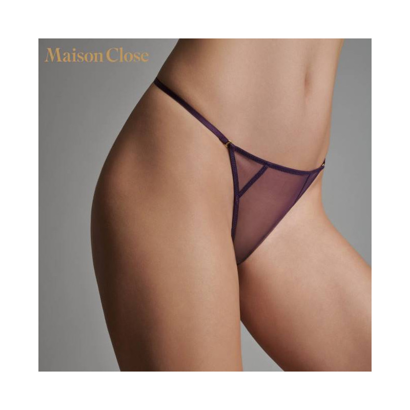 Mini thong in tulle of an absolute transparency. Very thin elastic bands linked by a golden ring at the hollow of the kidneys.