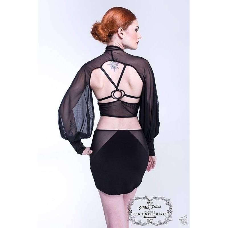 Splendid short and low cut dress combining two materials, veil and wetlook for a dressy/undressed effect to fall. The long and puffed sleeves will let see your arms in transparency, while your hips will be both discovered and veiled with the same fabric. Zip opening on the neckline
