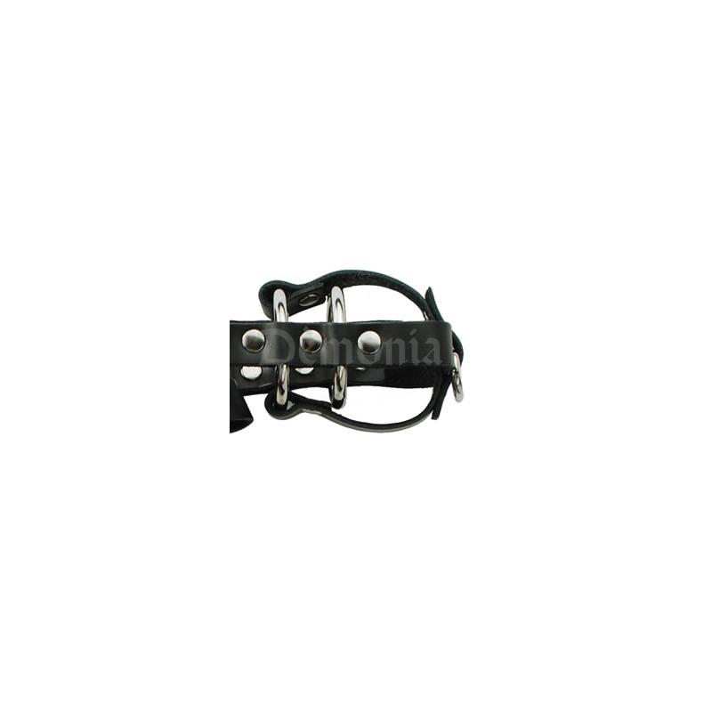 The leather strap surrounding the top of the testicles can be removed entirely and then tightened around the top of the testicles. It is closed with the 2nd padlock (2 possible settings)