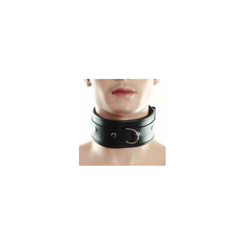 Simple and aesthetic black leather collar, with a metal ring on the front to hang a leash or a carabiner. This ring is held by a thin leather strap and riveted. Rivets are visible all around the collar.