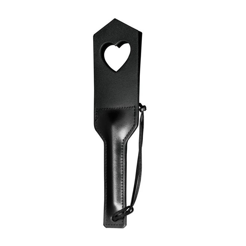 Paddle with a heart-shaped pattern cut out at the end and a strap.