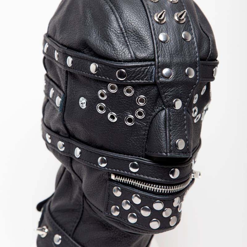 Studded SM leather balaclava with headband and zip. Adjustable and sturdy, it offers comfort and control for intense, captivating BDSM play.