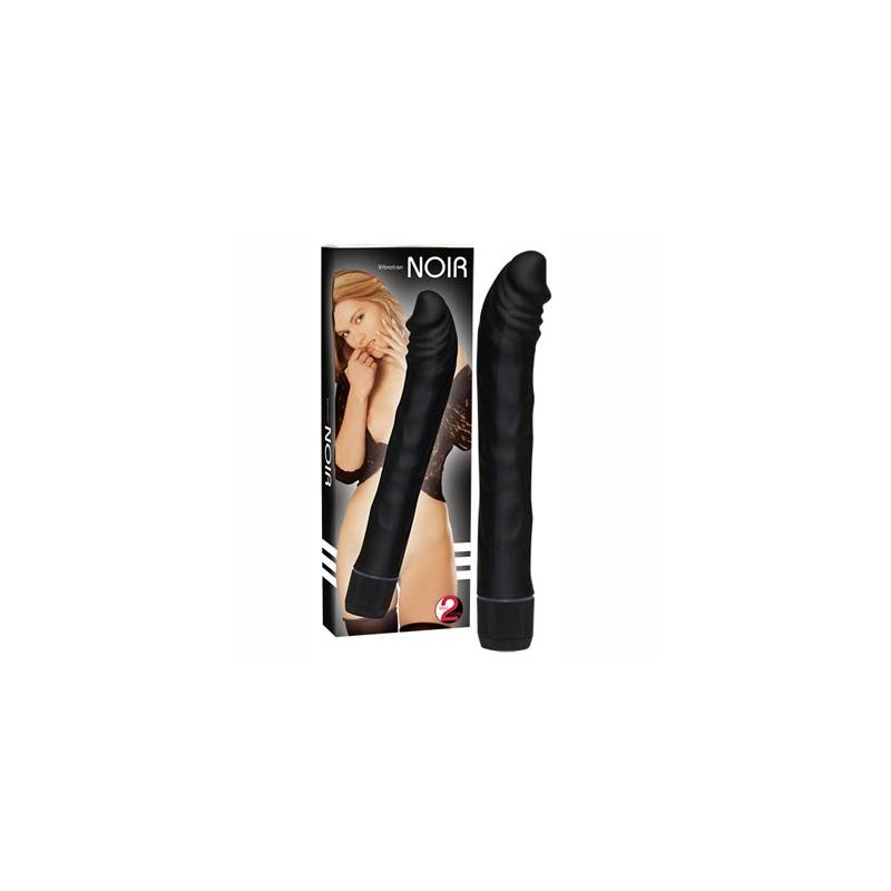 Black vibrating dildo with hard and smooth surface. Slightly veined and curved dildo in the shape of a penis.