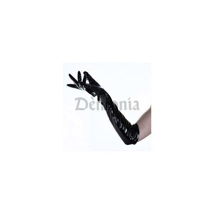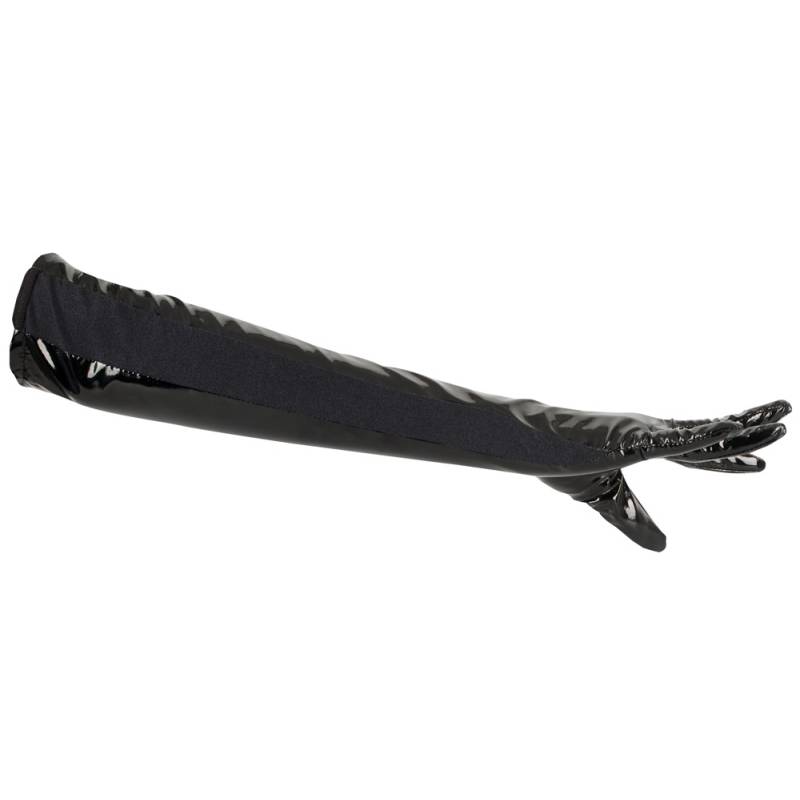 Elbow-length vinyl gloves with a small strip of thick, highly elastic webbing (almost invisible when worn) from the base of the pinky to the elbow to keep the gloves in place.