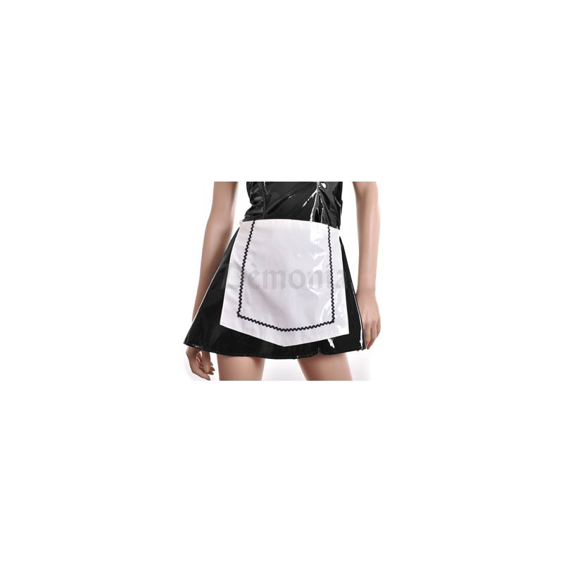 This outfit consists of a short dress with short sleeves, a collar that closes with a lace, a large neckline, a zip in the back, a small white vinyl apron with 2 ribbons that tie behind and a padded black vinyl headband with lace and an elastic ribbon.