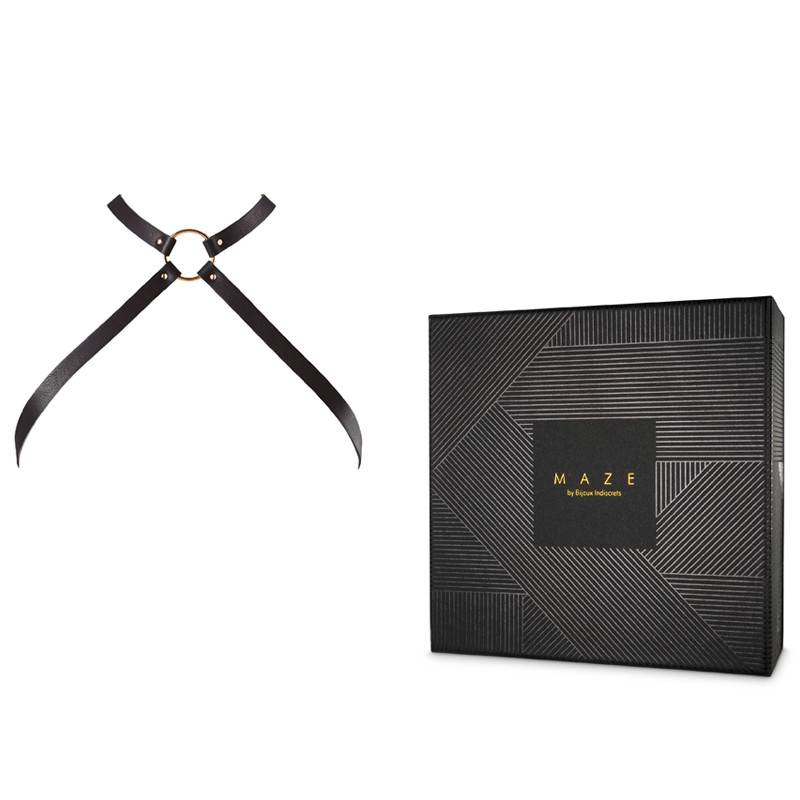 Black chest harness "MAZE" by Bijoux Indiscrets. This cross harness with a beautiful central metal ring located above the chest will enhance your chest. Wear it with your best lingerie or on your skin!