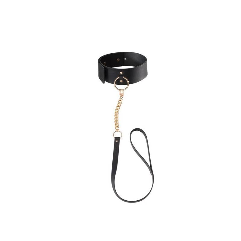 Wide MAZE necklace by Bijoux Indiscrets, with metal ring. Leaves golden metal chain part, polyurethane strap 100% vegan. A discreet and classy snap hook allows you to hang the leash on the collar or to use the collar alone.