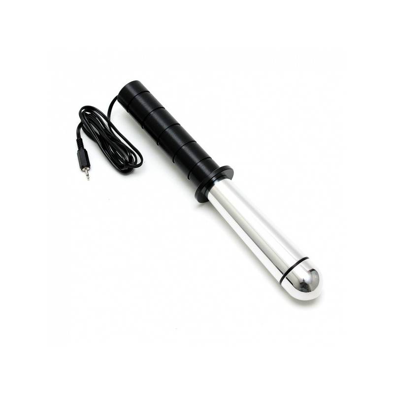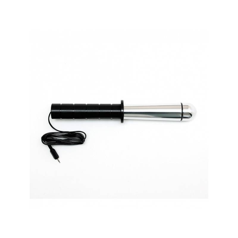 Metal dildo for electro stimulation, with black PVC handle. It can be inserted from 14cm and works in bipolar.