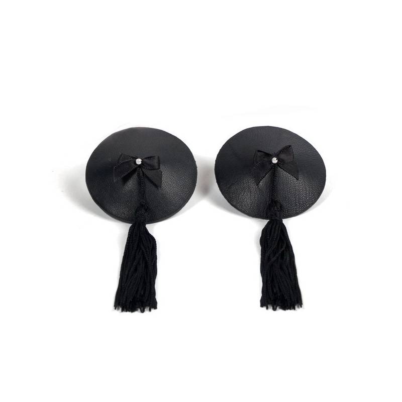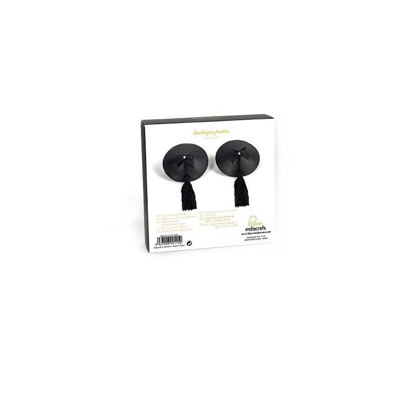 Nipple covers for indiscreet jewelry adhesive and reusable. (you just have to clean the adhesive part with a neutral ph soap and let it dry) They are decorated with small black satin bows with a small pearl in their center and small pompoms