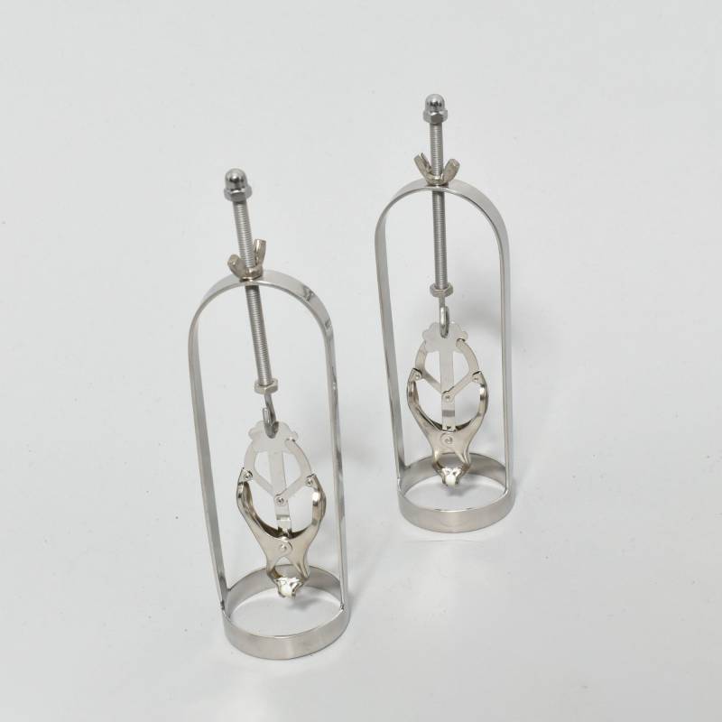 Pair of japonix breast clamps connected to a long screw to stretch the nipples.