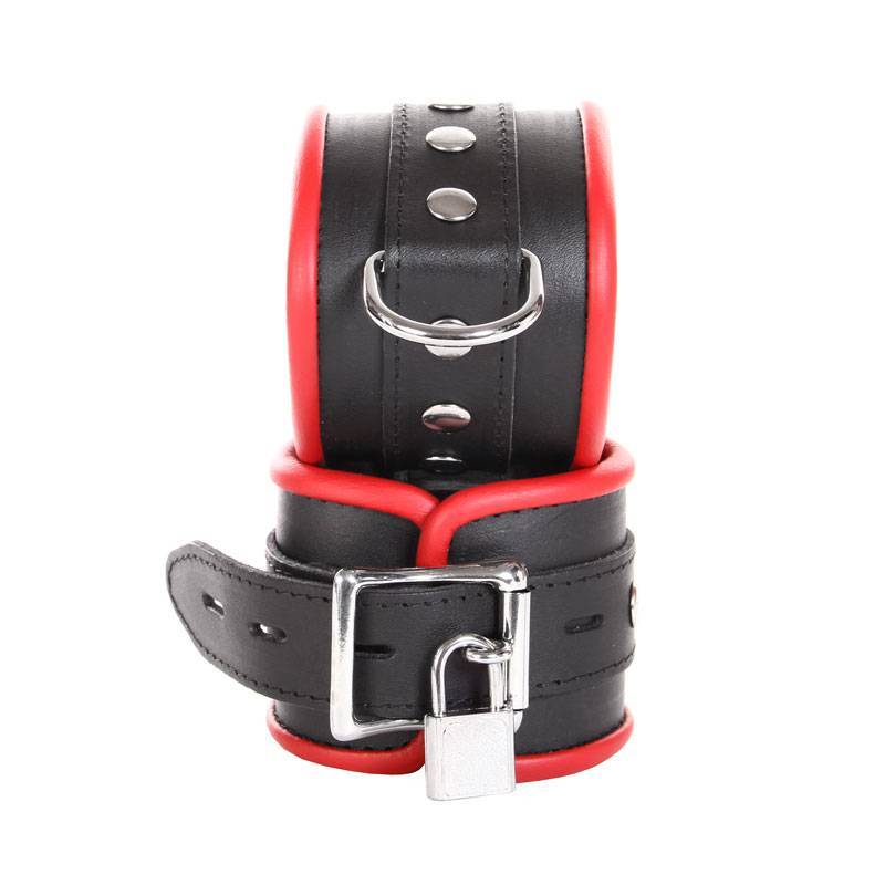 BLACK AND RED LEATHER HANDCUFFS