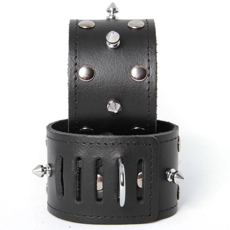 Hard and thick leather for these handcuffs with flat and spiked nails.