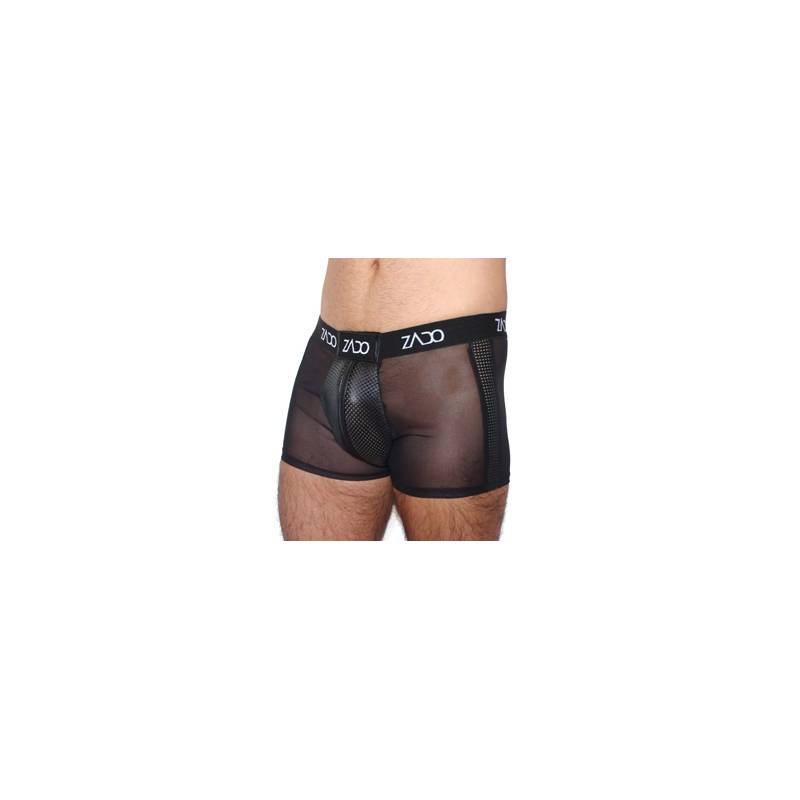 Sexy and original boxer, in transparent veil on the back and sides, and in perforated leather on the front at the level of the sex. 2 small bands of recall also in perforated leather come to decorate the hips.