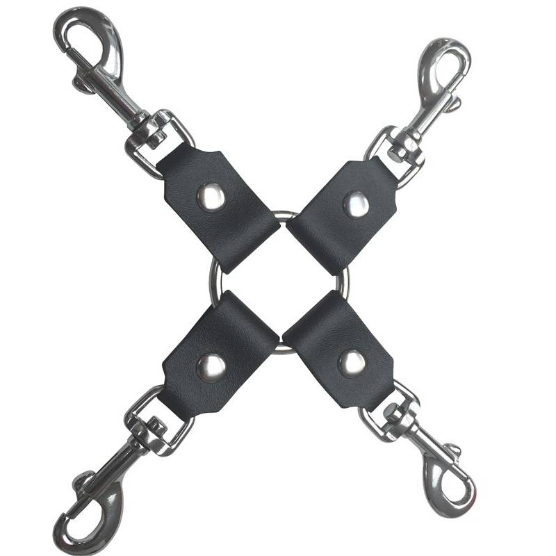 Cross restraint strap, made of high quality black leather with metal ring in its center and snap hooks at each end, from the"DEMONIA collection".