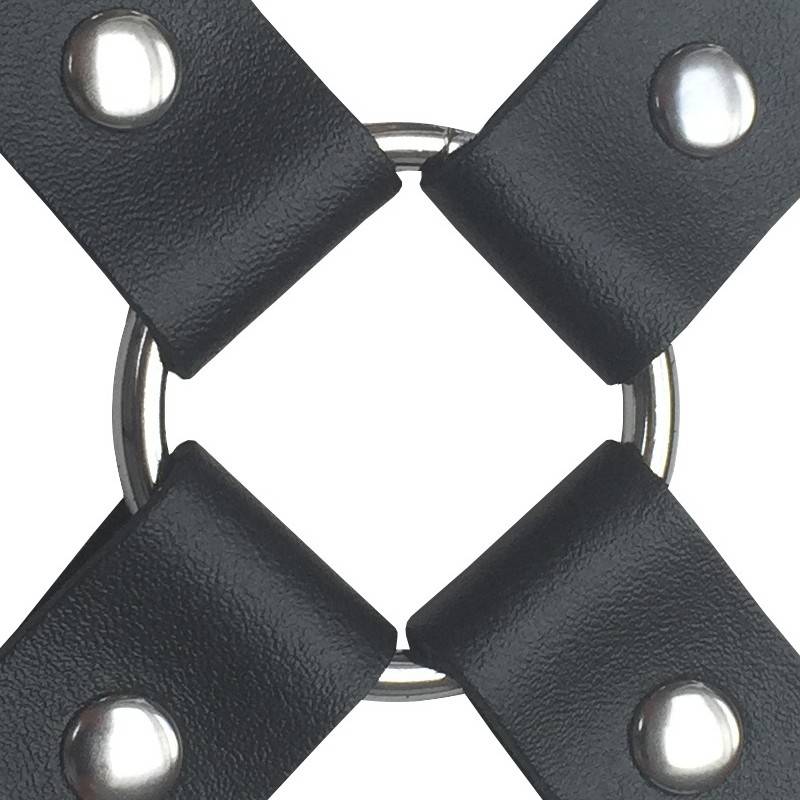 This cross-body restraint strap is made of 4 short straps, in thick and smooth leather, riveted and with a metal ring in its center.