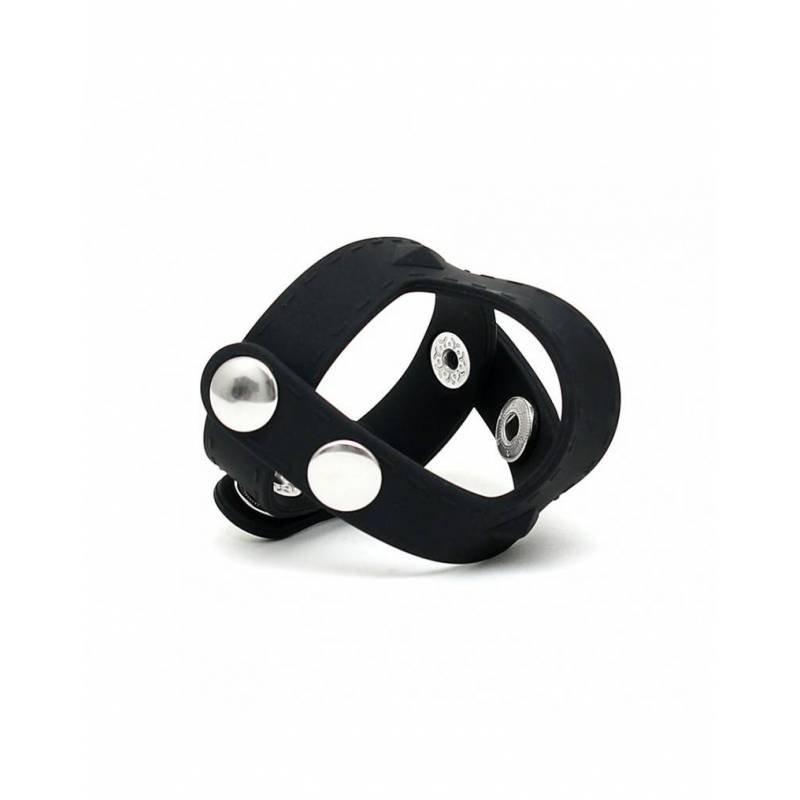 Cockring all in soft silicone adjustable with 3 snaps, composed of another adjustable strap 2 snaps to separate the testicles.