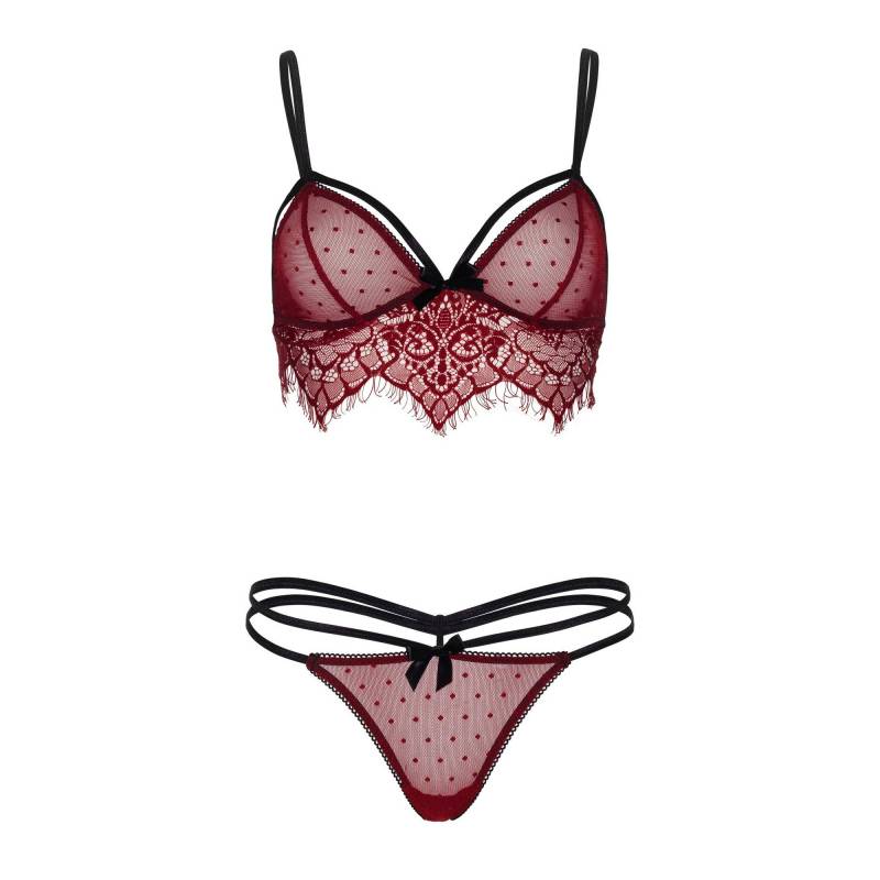 Beautiful set from Leg Avenue, with a transparent lace bra in Burgundy color with Swiss stitch, and with the lower part of the bra lined with "Chantilly" lace.