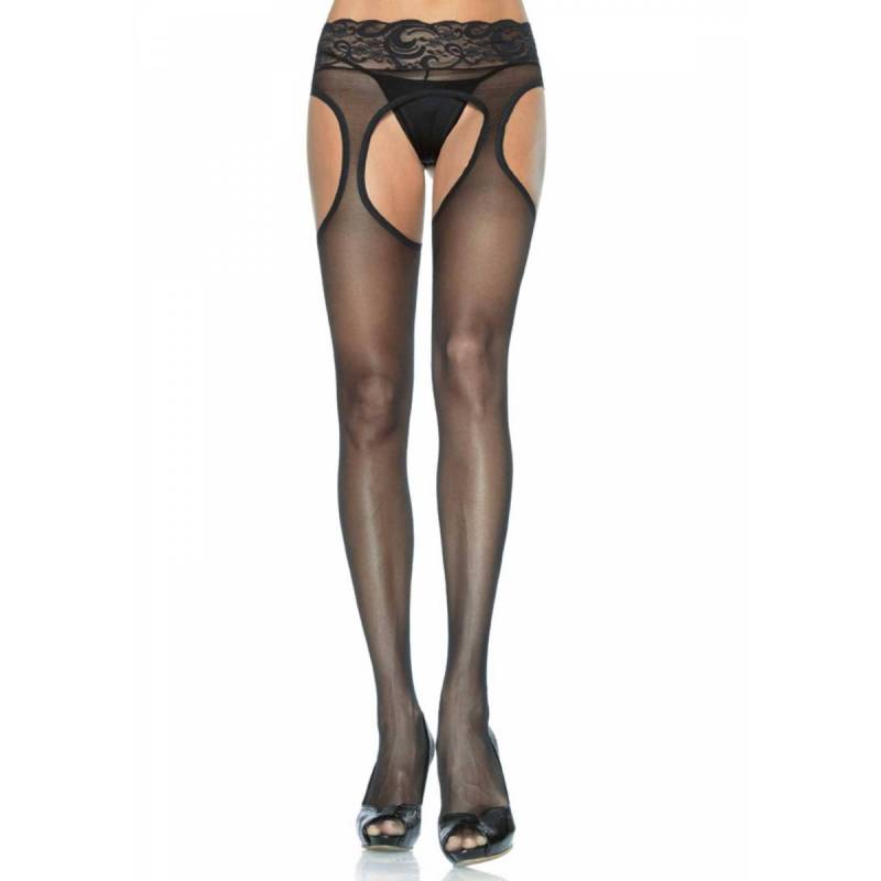 Nylon tights 20 deniers, clear imitation garter belt with wide lace belt.