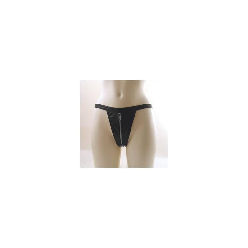 Black lacquered lycra thong with a naughty zip with double slider from the bottom of the stomach to the bottom of the back.