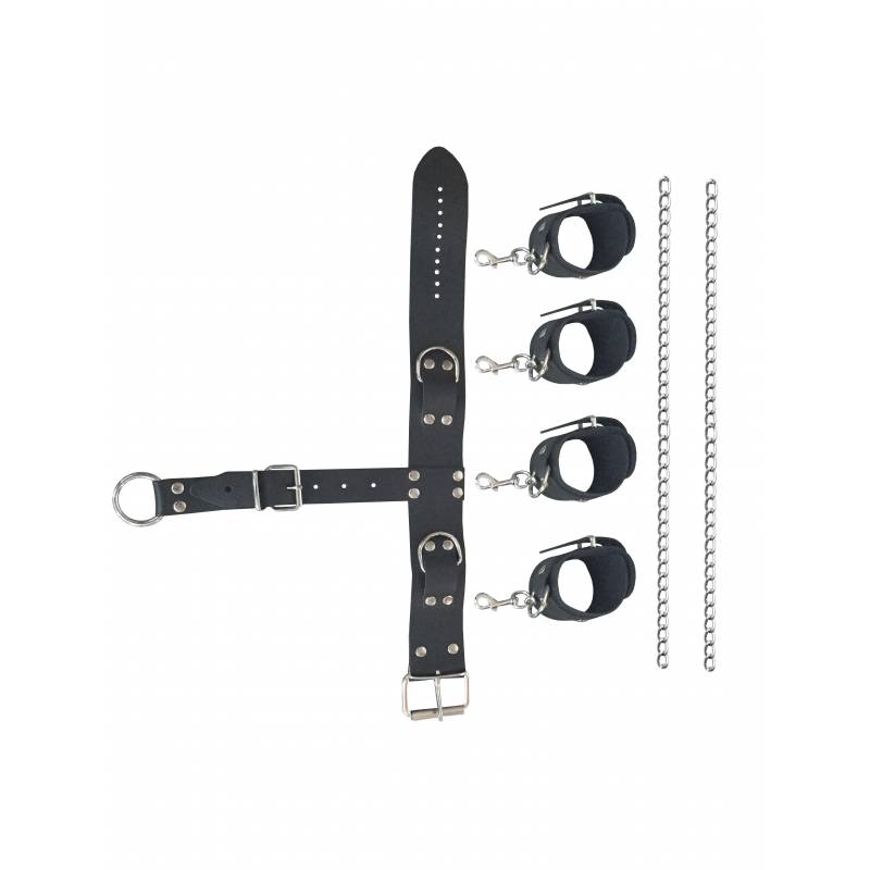 Great complete restraint kit with multiple possibilities, it includes: a thick collar, two pairs of handcuffs for wrists and ankles and their chains.