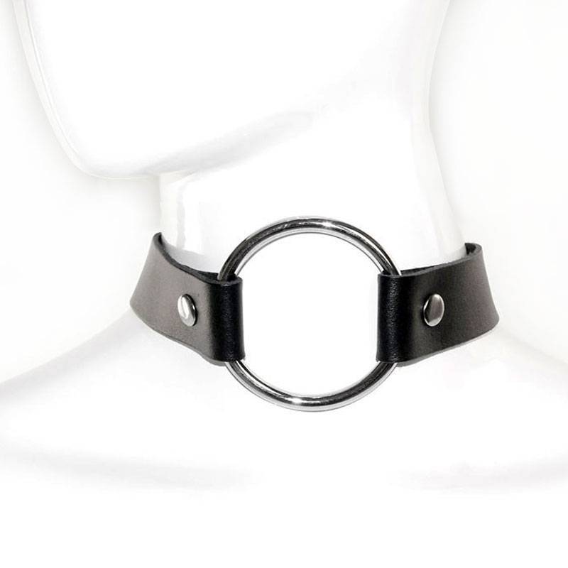 Collar de cuero negro con una gran anilla remachada (¡5 cm de diámetro interior!), en la que podrá colgar el accesorio de su elección, una correa por ejemplo...
