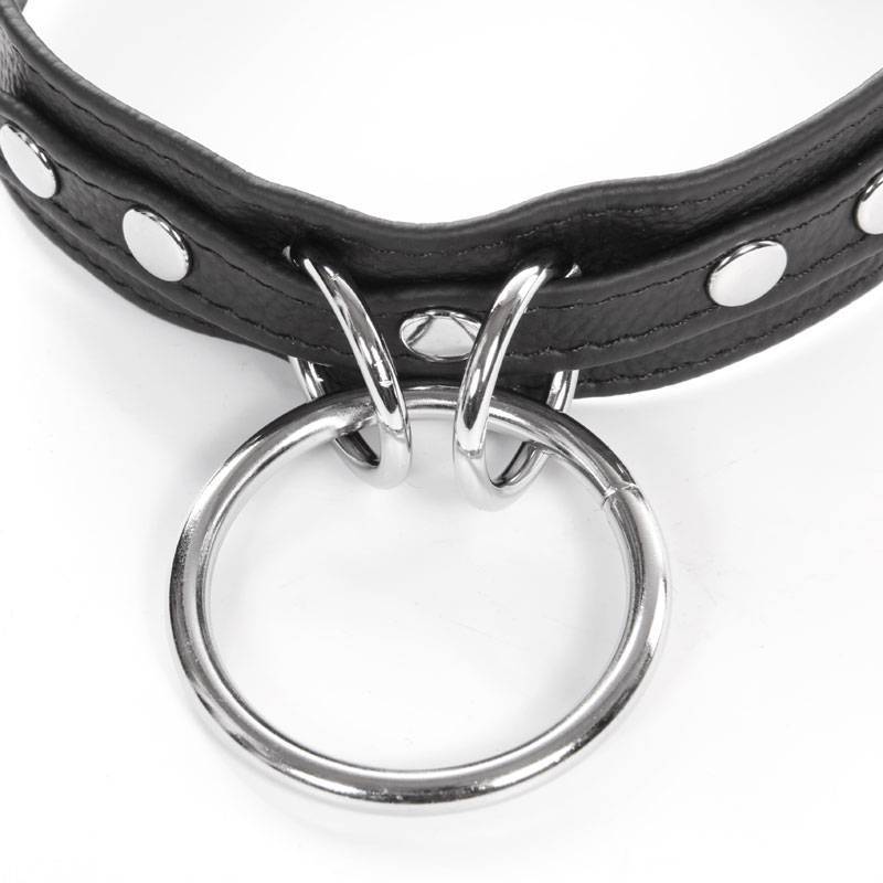Collar de cuero suave con una pequeña correa sujeta por remaches, compuesta por dos anillas a las que se une una tercera anilla mucho más grande. Se puede ajustar y abrochar con 3 botones a presión