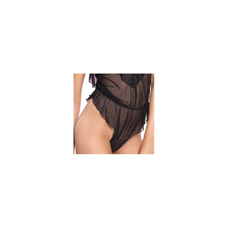 Body muy sexy en velo negro transparente de Leg Avenue, con escote pronunciado, volantes y drapeado, todo subiendo a la altura de las caderas.