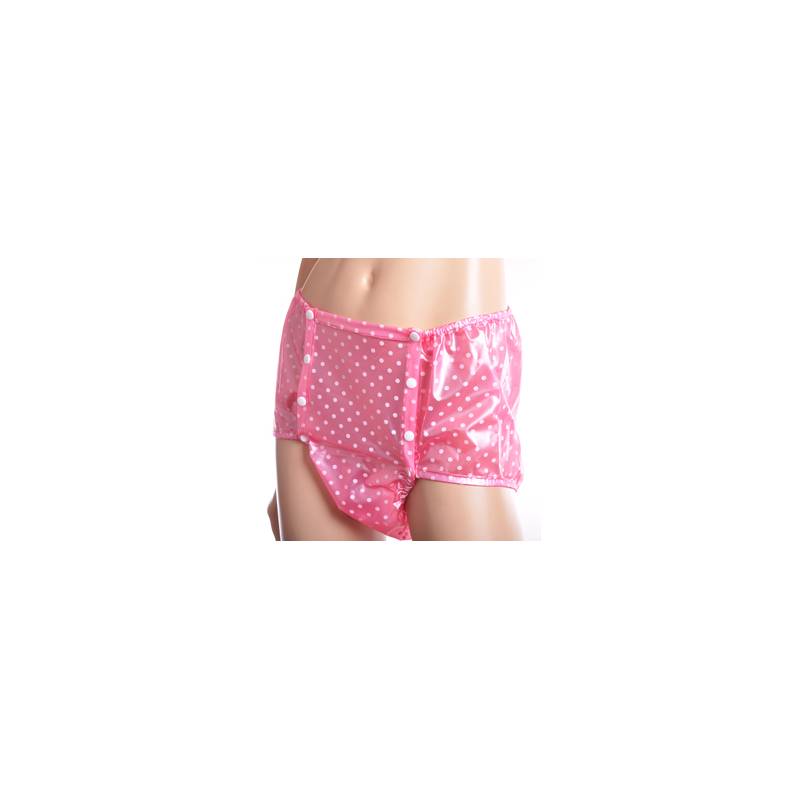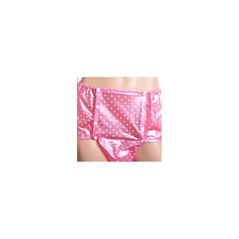 Estas braguitas de plástico rosa con lunares blancos tienen 8 broches de plástico en la parte delantera.