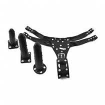 Cinturón consolador compuesto por una parte delantera con hebilla y 2 correas a cada lado con diferentes ajustes, una parte trasera con hebilla y 2 correas a cada lado con hebillas, una correa ancha que pasa entre las piernas con diferentes ajustes a cada lado y 2 orificios para colocar consoladores
